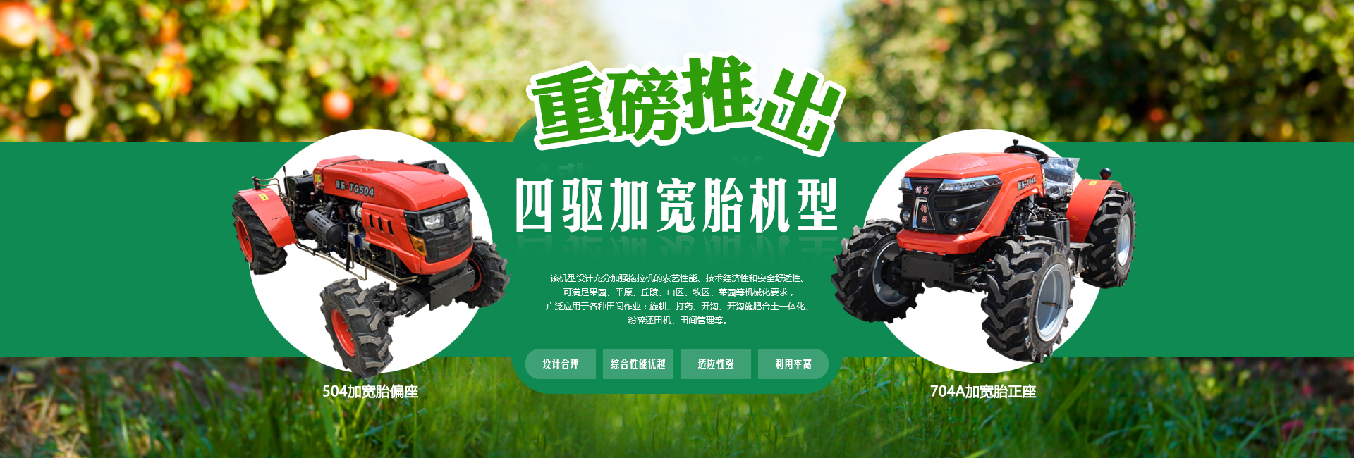 我公司主要經營產品有:果園管理機、拖拉機(窄距拖拉機、小型拖拉機、輪式拖拉機、山地拖拉機、四驅拖拉機)、果園施肥機(開溝施肥合土一體機、偏置開溝施肥復土一體機)、打藥機(風送噴霧打藥機、小型風送噴霧打藥機、大型風送噴霧打藥機、果園打藥機)、開溝機(中開溝機、偏置開溝機、果園開溝機)、粉碎還田機、果園打草機、碎枝機(大型碎枝機、開荒機、山地開荒機)、旋耕機(1米旋耕機、1.2米旋耕機、1.3米旋耕機、1.4米旋耕機、1.5米旋耕機以及偏置旋耕機)、雙鏵犁等。不斷研制出適應國內現代化果園需求的果園裝備系列產品,并取得國家多項專利。